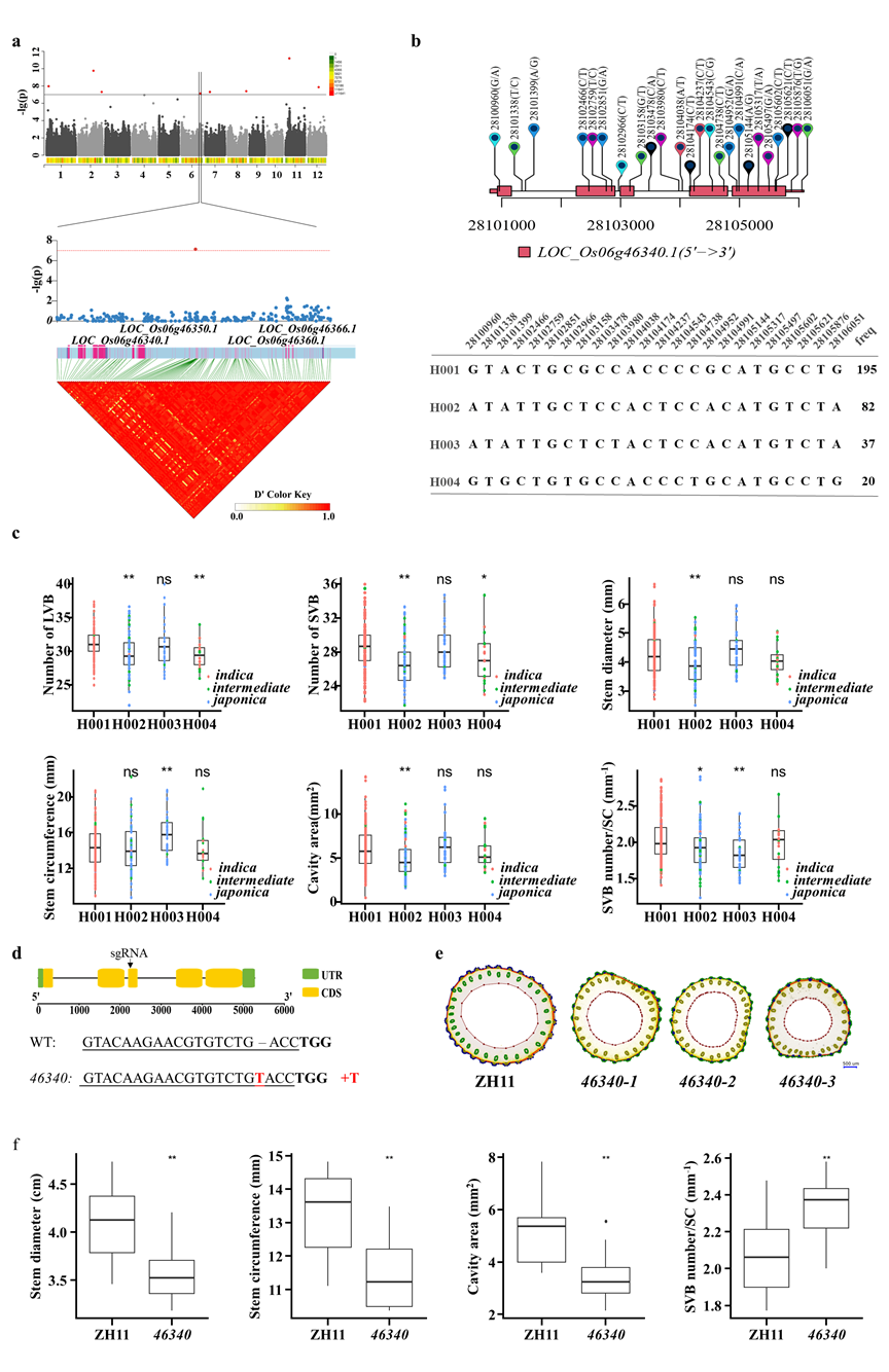 研究还对在第6号染色体上定位到一个影响小维管束数目的候选基因(LOC_Os06g46340)进行了遗传验证(图3)。该基因编码一个糖苷水解酶31家族成员,有四种主要单倍型。利用CRISPR/Cas9获得了单碱基T造成的移码突变体。突变体植株的茎秆直径、茎秆周长显著降低,小维管束数目与茎秆周长比值显著增加,表型的变化与单倍型分析结果一致。