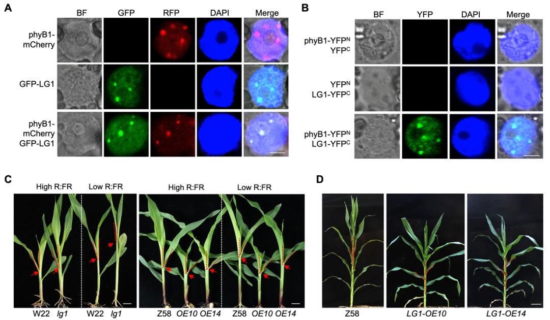 图 2. 玉米phyB与LG1互作协同调控株型建成和避荫反应