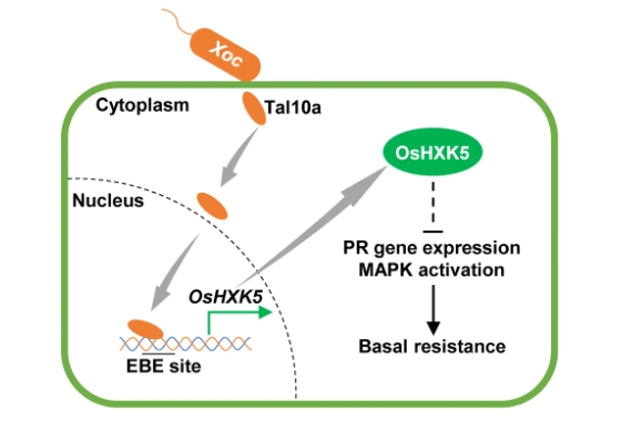 该研究发现,Tal10a是水稻细菌性条斑病菌的一个毒力因子,且Tal10a能够抑制水稻的防御反应。通过基因表达分析和EBE预测,确定水稻己糖激酶基因OsHXK5是Tal10a的候选靶标之一,并用RT-qPCR、EMSA和GFP报告分析进一步证明了Tal10a能够直接结合OsHXK5基因启动子区,并激活OsHXK5基因的表达。CRISPR/Cas9介导的 OsHXK5启动子区EBE的基因编辑可提高水稻对细菌性条斑病菌的抗性,而OsHXK5过表达则会增强水稻植株的感病性并损害水稻的防御反应。此外,同时编辑感病基因OsSULTR3;6和OsHXK5的启动子能够显著增强水稻对细菌性条斑病菌的抗性。综上所述,我们的研究初步阐明了Tal10a靶向OsHXK5促进感染的分子机制,并表明OsHXK5 可以作为水稻抗病育种的一个潜在靶标。