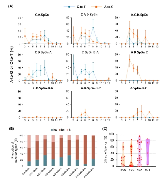 图2. PhieDBEs在靶位点产生有效的双碱基转换。(A)的编辑活性窗口;(B)DBE-SpGn所产生的突变类型比例;(C)DBE-SpGn在四种NGN-PAM靶位点的编辑效率。