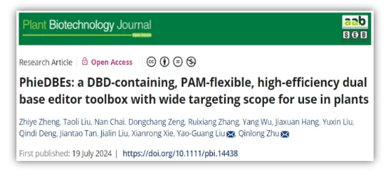近日,华南农业大学农学院、亚热带农业生物资源保护与利用国家重点实验室、岭南现代农业科学与技术广东省实验室刘耀光院士/祝钦泷研究员团队在国际著名学术期刊《Plant Biotechnology Journal》在线发表了题为“PhieDBEs: a DBD-containing, PAM-flexible, high-efficiency dual base editor toolbox with wide targeting scope for use in plants”的研究论文。该研究在前期开发的单碱基编辑器PhieCBEs和PhieABEs基础上,利用高活性胞嘧啶脱氨酶(evoFERNY)和腺嘌呤脱氨酶(Tad8e)、单链DNA结合结构域(DBD)与广靶向的SpCas9缺刻酶变体SpGn,成功开发了一套广靶向的植物高效双碱基编辑器PhieDBEs(plant high-efficiency dual base editors),进一步完善了植物基因编辑工具箱。此外,通过不同组合方式将功能元件DBD融合在双碱基编辑器不同位置,探究了其最佳融合位置和拷贝数,为开发多元件多重功能的基因编辑工具提供了重要参考。