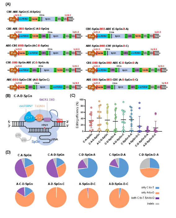 基于高活性的SpCas9n变体SpGn(NG-PAM),该研究利用高活性胞苷脱氨酶evoFERNY和腺苷脱氨酶TadA8e,以及人源RAD51 DBD的不同融合方式,构建了由9个编辑器组成的一系列DBE-SpGn载体(图1)。通过DBE-SpGn一系列载体对水稻中48个靶点编辑效率的系统性检测,结果发现在 SpGn 的 N 端融合了单拷贝 DBD 的 C-A-D-SpGn 平均编辑效率最高为41.9%,比不含DBD的C-A-SpGn (33.7%)显著提高,表明当两种脱氨酶和单拷贝DBD 均位于 SpGn 的 N 端时能更有效地实现双碱基编辑。而融合了双拷贝DBD的C-D-SpGn-D-A 和 A-D-SpGn-D-C的平均编辑效率仅2.3%和10.8%,这表明多拷贝的DBD并不能提高编辑效率,还会因功能元件较多而导致的空间位阻抑制了DBEs 发挥有效功能。此外,将脱氨酶融合在C端则使其对应产生的碱基脱氨频率大幅度降低,而融合在复合体N端时更有利于其发挥功能,说明脱氨酶也具有明显的N端位置优势。