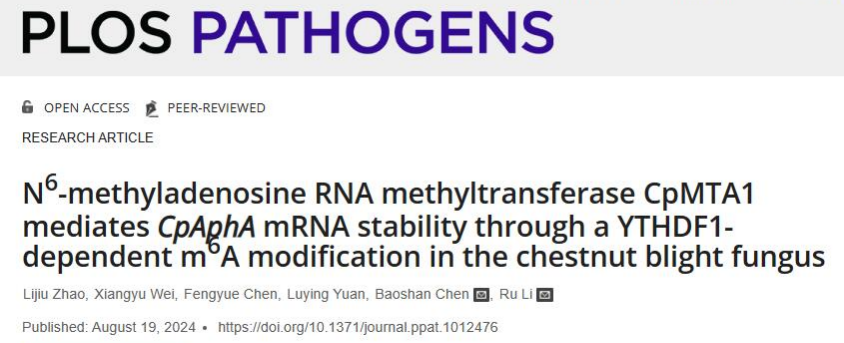 近日,英国上市公司365陈保善课题组在国际权威学术期刊PloS Pathogens上发表了题为“N6-methyladenosine RNA methyltransferase CpMTA1 mediates CpAphA mRNA stability through a YTHDF1-dependent m6A modification in the chestnut blight fungus”的研究论文,鉴定了植物病原真菌中的m6A甲基转移酶CpMTA1在真菌生长发育和致病力中发挥重要作用,并揭示了CpMTA1 通过依赖阅读蛋白YTHDF1 的 m6A 修饰调控磷酸酶 CpAphA mRNA 的稳定性。