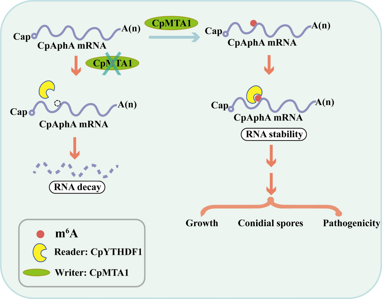 图 1. CpMTA1 通过 CpYTHDF1 介导的 m6A 修饰调控磷酸酶 CpAphA mRNA 的稳定性