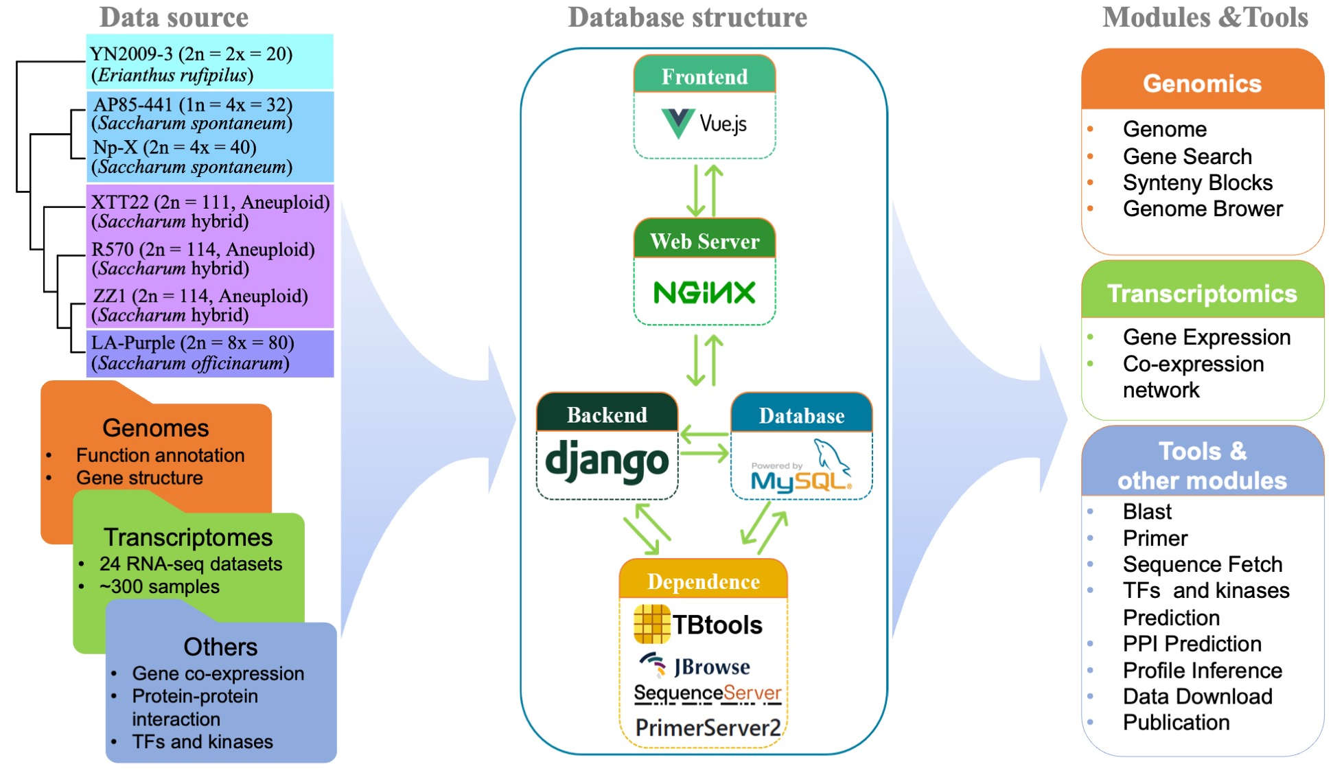 由于甘蔗极高程度的多倍体特性,其具有所有大宗作物中最为复杂的基因组。在过去的20多年里,巴西、法国、中国、澳大利亚、美国、南非、印度、泰国和哥伦比亚等,相继投入力量开展了甘蔗基因组领域的攻关,并取得了一定的成绩。近年来,随着基因测序和基因组组装技术的快速发展,甘蔗基因组的解析工作已经开始。张积森教授团队于2018年发布割手密AP85-441的基因组(Zhang等,2018),2022年发布了割手密Np-X基因组(Zhang等,2022),2024年发布了现代栽培种XTT22的基因组(Zhang等,2024),以及其他团队发布的现代栽培种R570基因组(Healey等,2024)和现代栽培种ZZ1基因组(Bao等,2024)。与甘蔗研究相关的转录组数据也丰富,涵盖了各种植物组织、发育阶段、昼夜节律等(Ma等,2020;Zhang等,2021)。为了更好地利用近年来生成的大量甘蔗基因组、转录组及其他数据,需要一个平台来组织和共享这些数据,在前人的研究中开发了多个甘蔗基因组数据库,如SymGRASS(http://symgrass.dyndns.org)(Belarmino等,2013),该数据库编目了甘蔗的同源基因,以及甘蔗miRNAs数据库(https://sysbiol.ib.unicamp.br/SCmiRNA/)(Zanca等,2010),整合了甘蔗miRNA初级前体和靶标的信息。尽管这些数据库非常有价值,但通常设计为要么收集全面的甘蔗基因组数据,要么集中于特定的组学领域。