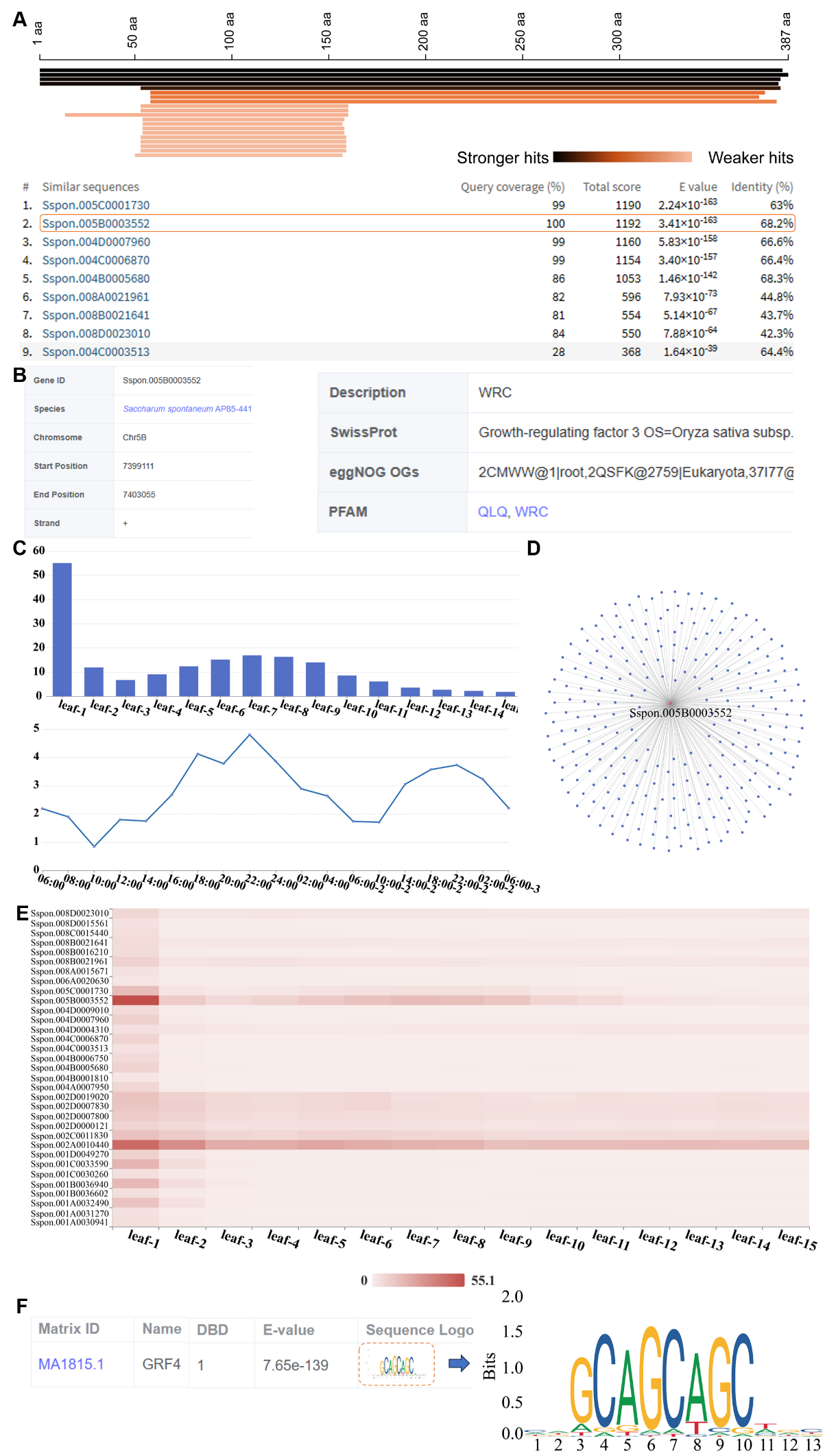 首先,我们使用水稻GRF蛋白质序列作为查询序列,通过ScDB工具模块中的Blast功能在AP85-441基因组中执行同源基因搜索(图5A)。接下来,为了获得最佳匹配基因(总分最高)的详细信息,我们在基因组模块中使用基因搜索功能搜索基因ID “Sspon.005B0003552”。在结果页面(图5B),用户可以获得该基因的详细信息。该基因位于5B染色体上,包含两个保守域QLQ和WRC,这些域对GRF基因至关重要(Kim和Kende,2004)。该基因的表达模式也在结果页面上显示。它在成熟茎和叶基部的表达水平最高。此外,该基因似乎对昼夜转变有反应,表达水平在上午10:00后上升,晚上10:00后下降(图5C)。接下来,我们使用共表达网络功能识别了与其共表达的262个基因(图5D)。此外,利用工具模块中的转录因子工具,我们识别了AP85-441基因组中的所有GRF家族基因。然后,我们为这些基因生成了基因表达热图,显示所有GRF基因表现出相似的表达模式(图5E)。由于GRF基因是转录因子,用户可以利用工具模块中的谱系推断工具预测其可能结合的启动子区域的基序(图5F)。