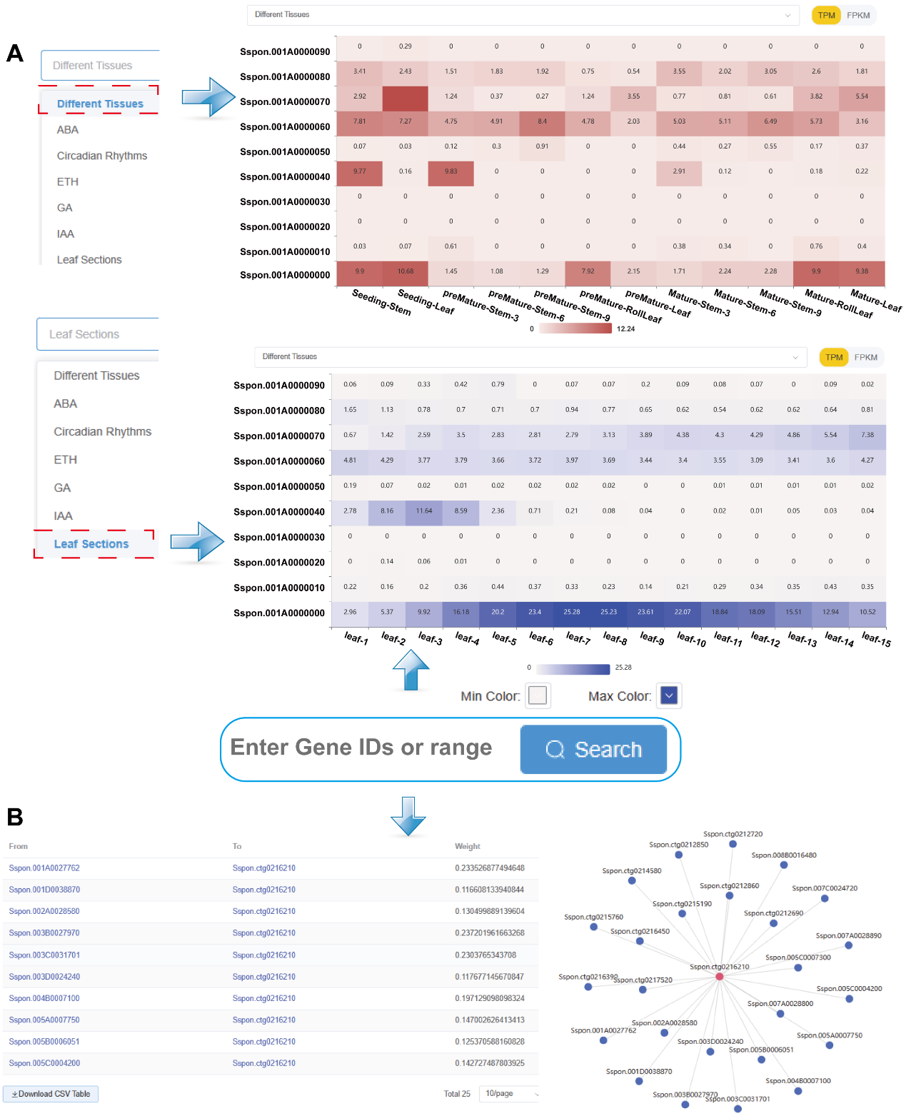 在此模块中,我们开发了基因表达热图的可视化界面(https://sugarcane.gxu.edu.cn/scdb/transcriptomics/gene_expression) (图3A)。用户可以与基因搜索相同的逻辑,通过基因ID或染色体位置搜索特定基因并分析其表达模式,从选择框中选择该物种所有的研究,任意指定热图使用TPM与FPKM作为表达量单位,并且可以自定义热图颜色方案,并导出SVG矢量图。使用WGCNA对这些转录组数据进行共表达分析,在共表达网络(Co-expression Network,https://sugarcane.gxu.edu.cn/scdb/transcriptomics/co_expression)页面中,用户可以通过基因ID检索其共表达网络的数据并可视化(图3B),并导出SVG矢量图。