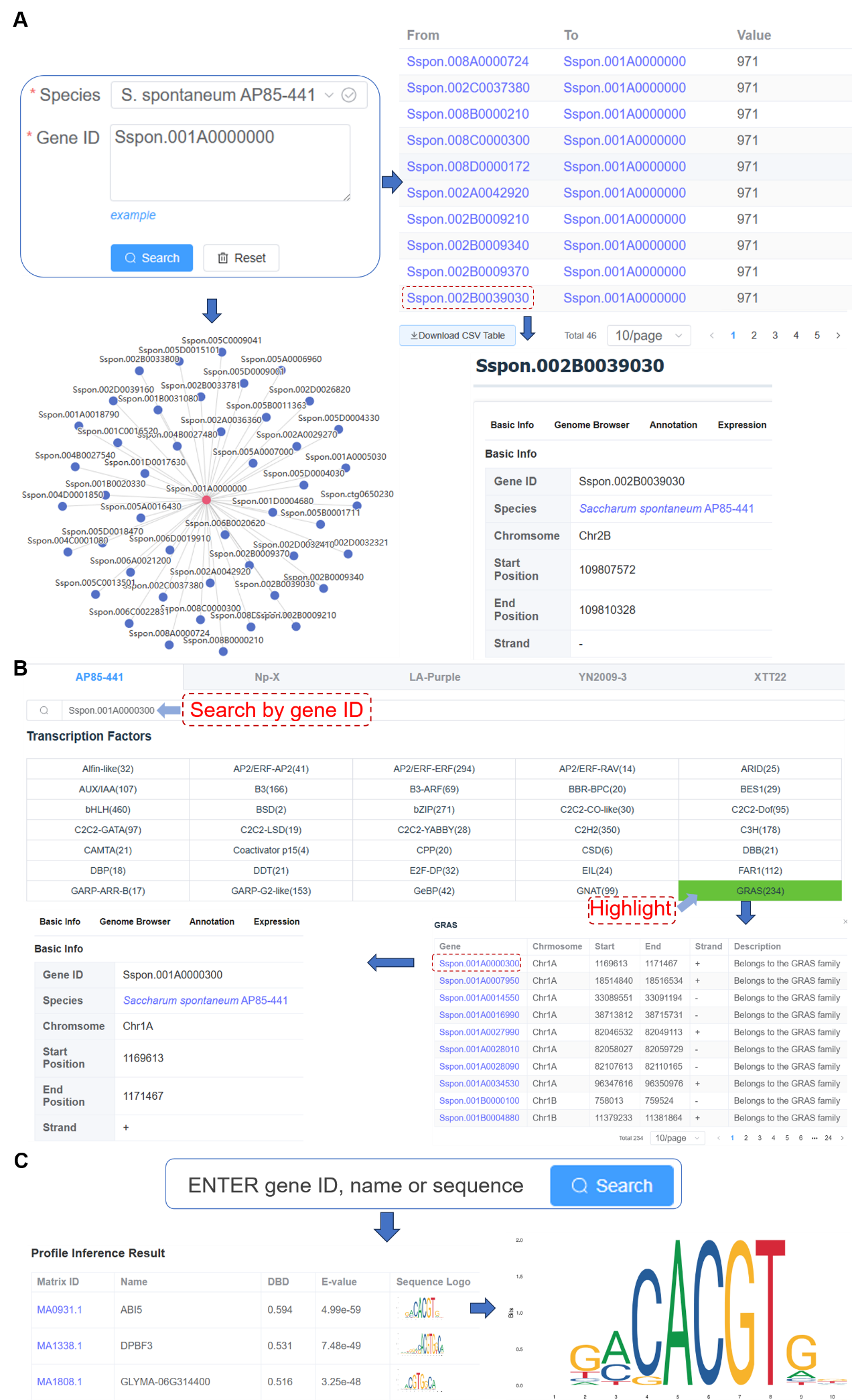 使用WGCNA对这些转录组数据进行共表达分析,在共表达网络(Co-expression Network,https://sugarcane.gxu.edu.cn/scdb/transcriptomics/co_expression)页面中,用户可以通过基因ID检索其共表达网络的数据并可视化(图3B),并导出SVG矢量图。