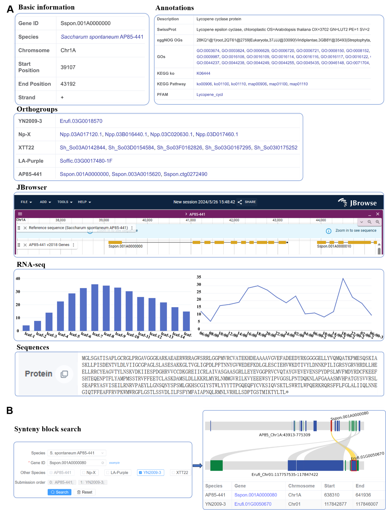 基因组页面(Genome ,https://sugarcane.gxu.edu.cn/scdb/genomics/genome)展示数据库收录物种的基因组基本信息,点击基因组名称会链接到一个单独的页面,显示详细的基因组信息、相关论文和染色体水平的结构注释细节,包括miRNA、tRNA等。基因搜索页面(Gene Search ,https://sugarcane.gxu.edu.cn/scdb/genomics/gene_search)用户可以通过基因ID或染色体位置使用基因搜索功能搜索基因。基因搜索结果页面包含基本基因信息、注释结果(包括KEGG通路和GO功能注释)。在首页的高级搜索和基因搜索页面搜索到的基因点击链接即可进入基因详情页面,包含该基因的染色体位置信息、功能注释、表达量柱形图、同源基因以及CDS、蛋白质和上下游序列(图2A)。在同源基因搜索页面(https://sugarcane.gxu.edu.cn/scdb/genomics/orthologous)用户可以通过基因ID搜索以获取其他甘蔗基因组和拟南芥和水稻中同源基因的信息。支持的物种及基因ID如页面案例所示。共线性页面(https://sugarcane.gxu.edu.cn/scdb/genomics/synteny_blocks)用于显示甘蔗基因组之间的共线性(图2B)。包含两个工具,在基因共线性中,通过基因ID检索其在其他物种中的共线性基因。在染色体共线性中,可以指定任意两个基因组的任意染色体的共线性,并且可以随意交互放大以及转向染色体。基因组浏览器(Genome Browser)页面提供访问JBrowse2(Diesh等,2023)的功能,该工具用于显示可用参考基因组组装的基因组序列、注释的基因组特征和其他基因组信息。JBrowse2允许用户添加轨道、搜索特定区域,并导出数据和图形,便于详细的基因组分析和可视化。