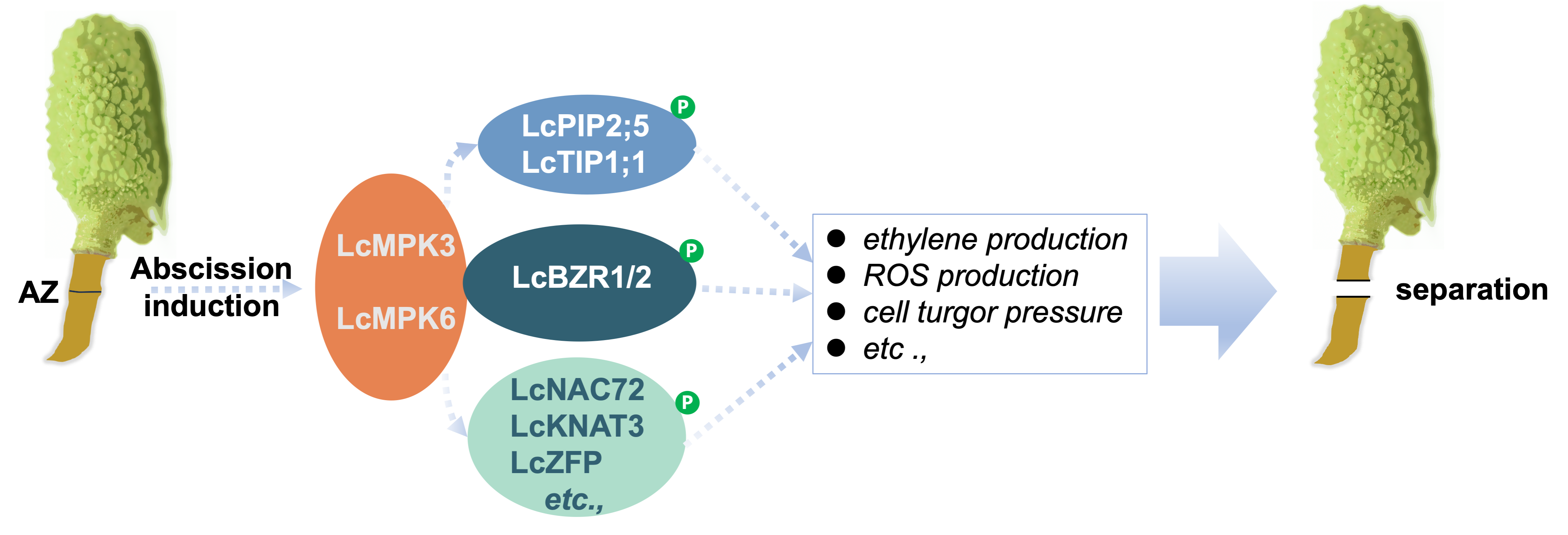 本研究揭示了LcMPK3/6具有正调控荔枝落果的功能,并通过酵母双杂交筛库获得了荔枝落果中LcMPK3/6的底物蛋白,并通过体内体外实验确证了LcMPK3/6可通过蛋白互作磷酸化修饰转录因子LcBZR1/2。既有的研究表明,转录因子LcBZR1/2可通过转录调控乙烯合成介导BR对荔枝落果的调控(Ma et al., 2021)。在番茄中,TIP水通道蛋白可通过介导离区细胞乙烯合成、ROS稳态和细胞膨压调控花脱落(Wang et al., 2021)。据此,该研究推测在荔枝落果中,LcMPK3/6可能通过调控这些信号途径,进而促进荔枝落果。总之,本研究不但为进一步阐明LcMPK3/6调控荔枝落果机制研究指明了方向,也为解析MPK3/6调控器官脱落提供了重要参考。