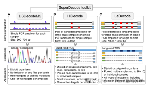 为满足科研人员在不同应用场景下的数据分析需求,实现对基因编辑材料的有效和快速鉴定,该团队和合作单位研究人员开发了一款超级解码软件工具箱SuperDecode,包括电脑本地版和在线网络版。SuperDecode可以实现对利用不同测序平台产生的测序数据进行高效分析,并且优化了基于PCR的多样本混合测序文库构建方法,可实现高通量高效数据分析,从而满足科研人员对不同样本通量、不同突变类型鉴定的需求。