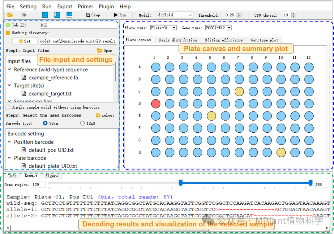 SuperDecode包含3个子软件模块:DSDecodeMS、HiDecode以及LaDecode,分别对应Sanger测序、二代测序结果以及三代测序数据的解码分析。其中,DSDecodeMS是研究团队此前开发的网页版工具DSDecod/DSDecodeM(Liu et al., 2015; Xie et al., 2017)的升级本地版,添加了去除Sanger测序两端低质量序列的功能,具有更快的分析速度和更为友好的使用界面,可直接读取靶点扩增子的Sanger测序峰图,分析样本的突变类型。HiDecode能对添加特定barcode序列的多样本混合文库的二代测序文件进行自动拆分和突变解码,实现对多种类型样本的高通量分析,包括二倍体、多倍体、细胞系等。HiDecode还提供了96 × n种特异性barcode序列,理论上可一次性检测多达9,216 (96 × 96)个样本的突变类型。LaDecode则是基于第三代单分子测序技术,对包含多个靶点的目的区域进行PCR扩增,并通过添加barcode的方式建立混合文库进行测序和分析。利用三代测序技术读长较长的优势,LaDecode能够识别目的区域中的各种复杂的突变(如靶点之间的片段替换或插入等),并区分检测样本的所有单倍型。因此,该工具特别适用于分析特定区域内进行多靶点编辑(如启动子平铺删除、饱和突变等)引起的复杂变异。该论文提供了利用各模块分析不同基因组编辑样品的示列。