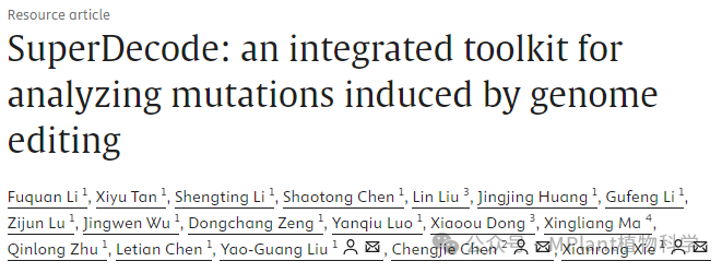 2025年3月4日,华南农业大学亚热带农业生物资源保护与利用国家重点实验室、农学院刘耀光/谢先荣团队联合多家单位在Molecular Plant在线发表了题为“SuperDecode: an integrated toolkit for analyzing mutations induced by genome editing”的研究论文。该论文报道了基于Sanger测序、二代测序和三代测序技术对各种基因编辑样品的不同类型突变进行高效检测的超级解码软件工具箱SuperDecode。