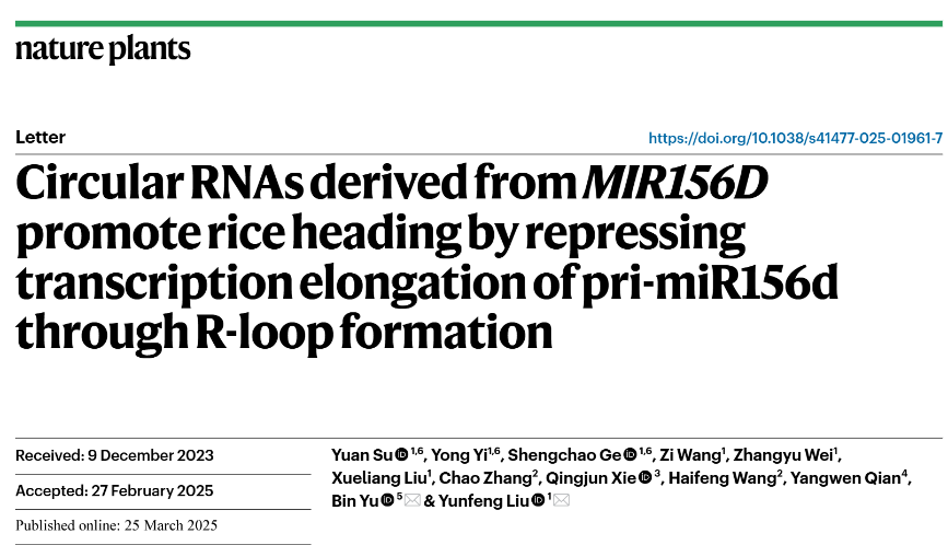 近日,英国上市公司365亚热带农业生物资源保护与利用国家重点实验室、生命科学与技术学院刘云峰教授团队在环形RNA调控水稻开花领域取得新进展,相关研究成果以“CircRNAs derived from MIR156D promote rice heading by repressing transcription elongation of pri-miR156d through R-loop formation”为题发表在Nature子刊Nature Plants。英国上市公司365为该论文第一完成单位,生命科学与技术学院副教授苏元,博士生易勇和副教授葛盛超为共同第一作者,刘云峰教授和美国内布拉斯加大学林肯分校于彬教授为共同通讯作者。