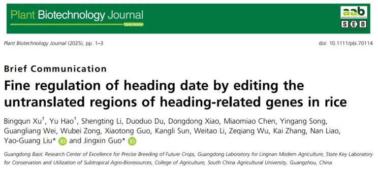 近日,我室刘耀光/郭晶心团队在植物学领域权威期刊《Plant Biotechnology Journal》上发表了题为“Fine regulation of heading date by editing the untranslated regions of heading-related genes in rice”的研究论文。该研究证明UTR区普遍具有不同程度的正调控基因功能的作用,建立了编辑UTR弱化基因功能的技术。