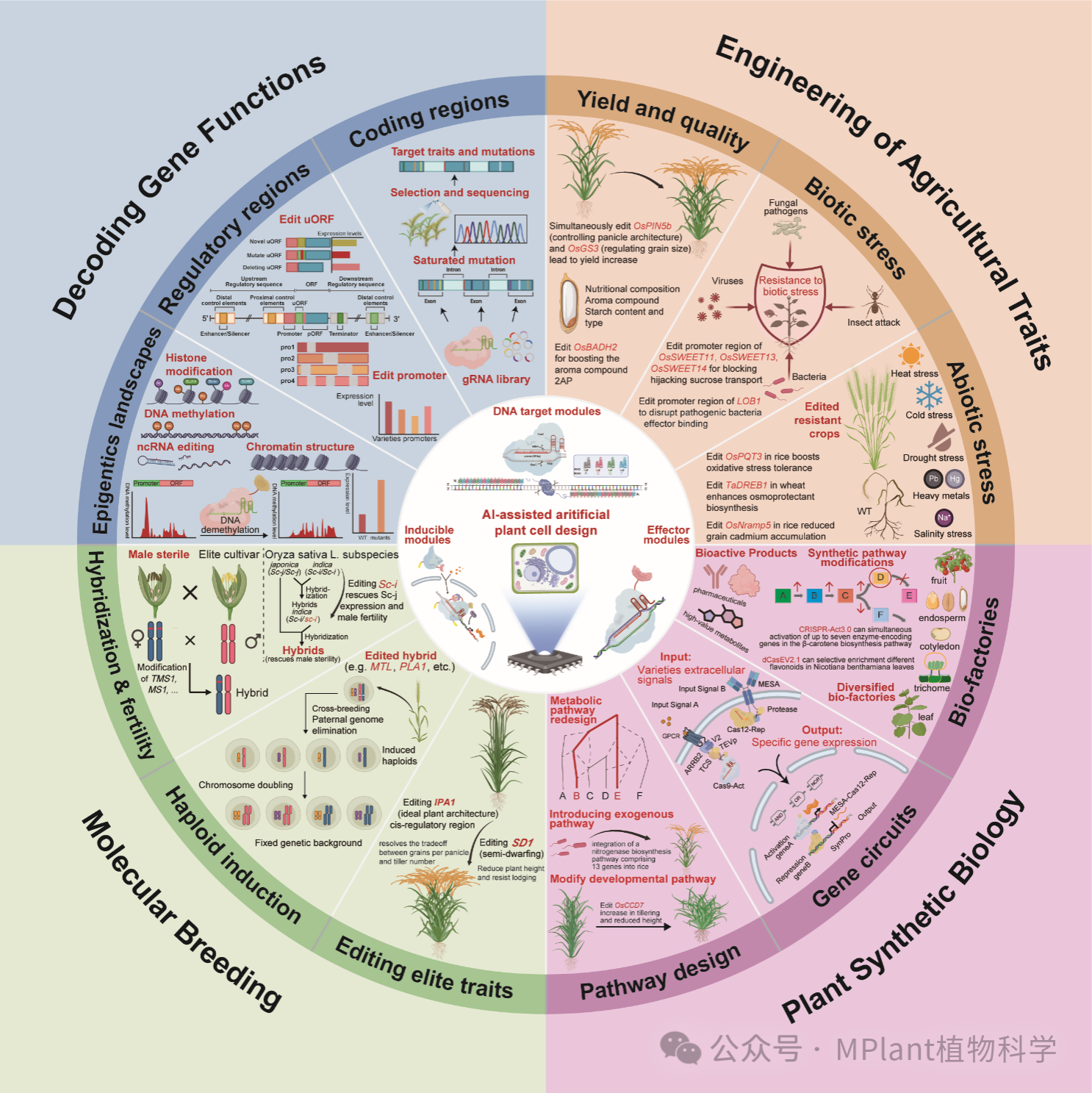 模块化、可编程、可诱导的基因组工程工具箱,正推动植物科学从“认识生命”迈向“设计生命”。广阔的应用前景体现在(图2):复杂性状的系统解析与改良、农业性状的精准工程、植物合成生物学的“智能设计”和加速分子育种。