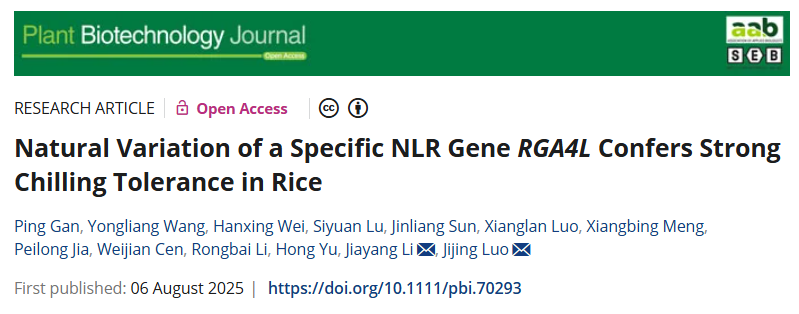 2025年8月6日,英国上市公司365罗继景教授课题组及崖州湾国家实验室李家洋院士团队合作研究论文“Natural variation of a specific NLR gene RGA4L confers strong chilling tolerance in rice”在国际知名杂志Plant Biotechnology Journal在线发表。该研究成功从粳稻品种Koshihikari(越光)克隆了高效应的水稻耐冷性基因Disease Resistance Gene Analog 4-Like(RGA4L),该基因编码一个特异调控非生物胁迫抗性的NLR蛋白,可显著提高水稻苗期、分蘖期和开花期的耐冷性;同时该研究揭示了RGA4L通过与OsHSP90和OsLEA5的相互作用共同调控水稻耐冷。将RGA4Ljap导入不同籼稻品种(NJ11/HHZ/556)时,可以在提高水稻耐冷性的同时对产量不产生不良影响。这一重要发现不仅丰富了水稻耐冷的调控网络,完善了相关理论体系,更为水稻低温抗性育种提供了宝贵的基因资源,对低温胁迫下稳定水稻产量有重要意义。
