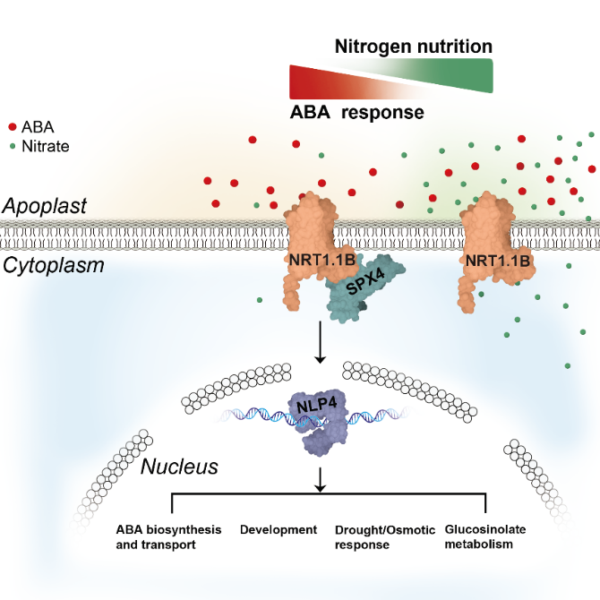 该研究发现,硝酸盐受体NRT1.1B对逆境激素脱落酸(ABA)具有更高的亲和力,它能作为细胞膜ABA受体,介导其信号感知与传导。ABA与硝酸盐竞争性结合NRT1.1B,进而实现氮营养状态与逆境信号的整合。