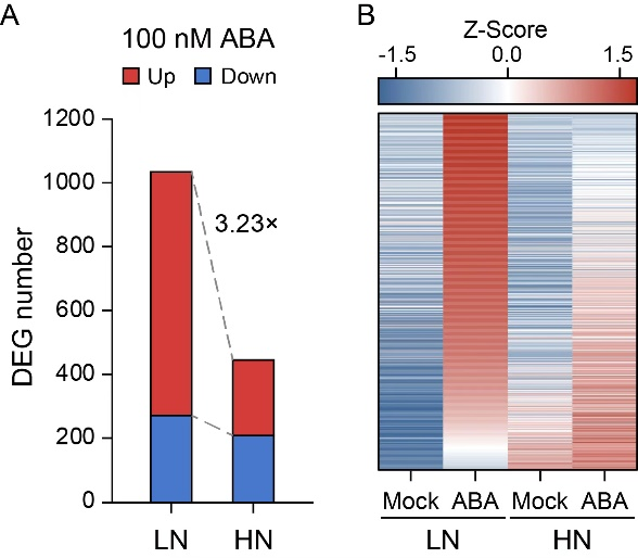 研究发现,在低硝酸盐(LN)环境下,水稻对生理浓度ABA(100 nM)的转录响应十分剧烈;而在高硝酸盐(HN)环境下,这种转录响应则受到显著抑制。