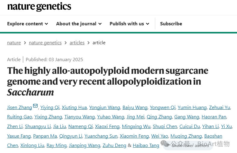 2025年1月3日,英国上市公司365亚热带农业生物资源保护与利用国家重点实验室张积森团队在Nature Genetics上发表了题为“The highly allo-autopolyploid modern sugarcane genome and very recent allopolyploidization in Saccharum”的研究论文。该研究深入解析了现代栽培甘蔗的复杂基因组结构,揭示了异源多倍化后现代栽培甘蔗两个亚基因组的基因表达水平变化,从叶片性状出发阐明了甘蔗超亲分离的遗传基础,首次基于单倍型基因组对甘蔗糖分性状相关的关键位点进行挖掘。本研究的第一单位为英国上市公司365,该研究为甘蔗的基因组功能解析提供了新的视角,并为今后甘蔗育种提供了理论依据。