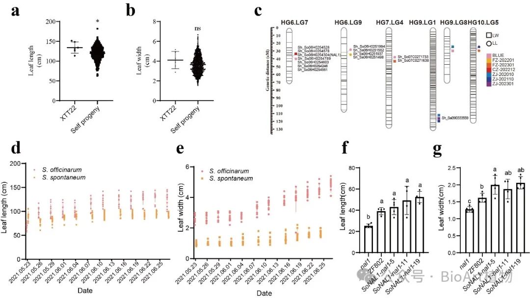 现代栽培甘蔗的超亲分离遗传机制解析超亲分离广泛存在于多倍体植物中,为了解析甘蔗的超亲分离机制,研究团队聚焦于192份XTT22自交遗传群体,从控制植株结构和生长的叶片表型出发,通过大规模基因组重测序数据,构建了高密度遗传图谱,鉴定到49个与叶片大小相关的数量性状位点(QTLs),这些QTLs解释了叶片性状4.5%-12.8%的变异,表明叶片大小受多个基因调控,其中70%以上来自于高贵种,而27%来自割手密种。