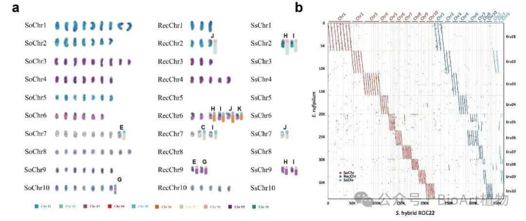 现代栽培甘蔗新台糖22号(XTT22)是我国甘蔗育种历史上最为重要的骨干亲本,种植面积曾连续15年占到我国甘蔗种植面积的85%以上,我国超过90%以上的第四代甘蔗品种都是XTT22的后代。本研究首先利用Oligo-FISH技术对XTT22的基因组结构进行了深入解析,揭示了大量的染色体断裂融合现象。综合利用PacBio、Illumina和Hi-C测序技术,研究团队成功构建得到一个9.3 Gb,染色体数为97条的基因组。