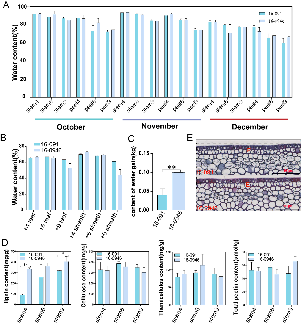 研究对94份甘蔗种质的8个生长裂缝相关性状进行了系统评估。统计分析结果显示,生长裂缝节间数(NGCI) 与 生长裂缝率(GCR) 两个指标可有效用于评估甘蔗的生长裂缝程度。进一步将该评价体系应用于392份甘蔗种质资源时,筛选出表现极端的两份材料:16-091(无生长裂缝)与 16-0946(生长裂缝严重)。尽管两者的组织含水量相近,但16-0946在短时间浸泡后吸水量显著增加,说明短时间快速吸水能力可能是生长裂缝形成的重要驱动因素。