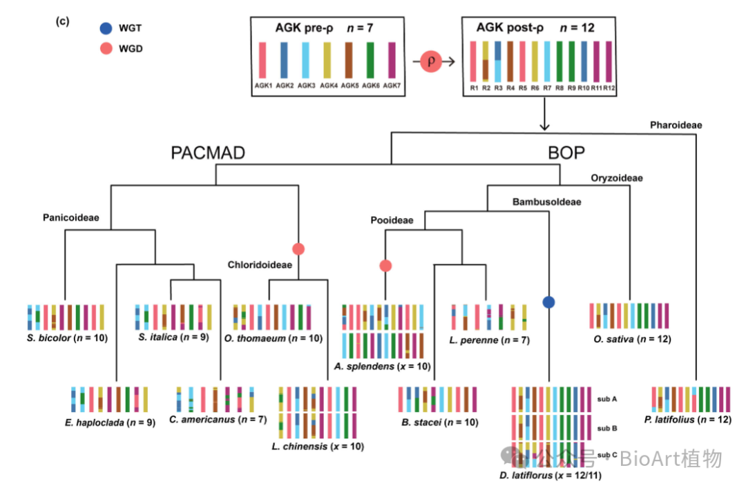 研究发现,禾本科植物中共保留了三对由ρ-WGD事件产生的PdCPs,它们在禾本科长期演化过程中发挥着重要作用,并在不同亚科间呈现出差异化的染色体重排模式。尤为引入注目的是,其中一对具有共同祖源关系的PdCPs(AGK7血缘)在多个禾本科亚科中持续富集NBS-LRR抗病基因,并始终保持保守而稳定的低转录活性状态。