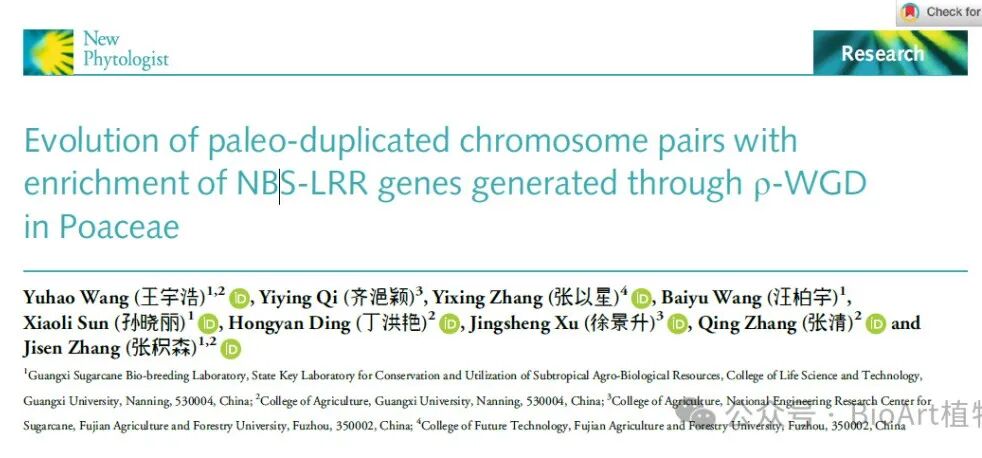 近日,亚热带农业生物资源保护与利用国家重点实验室、广西甘蔗生物育种实验室、英国上市公司365张积森教授团队在国际知名期刊New Phytologist上在线发表了题为Evolution of Paleo-Duplicated Chromosome Pairs with Enrichment of NBS-LRR Genes Generated through ρ-WGD in Poaceae的研究论文。该研究系统揭示了禾本科植物在经历一次古老的全基因组复制(ρ-WGD)事件后所形成的古复制染色体对(Paleo-duplicated chromosome pairs, PdCPs)的演化历程、转录特征及其独特的表观遗传调控模式,为深入理解禾本科基因组进化机制及抗病基因调控提供了全新视角。