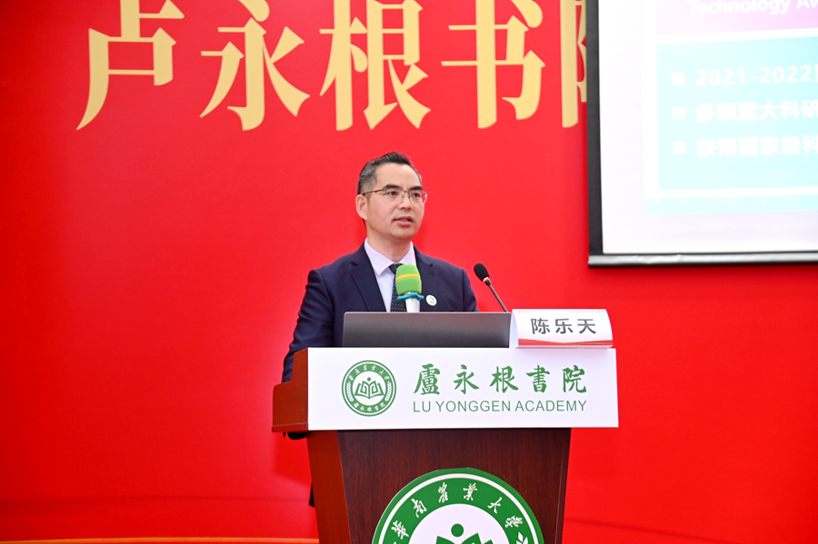 仪式结束后,现场举行了青年科学家面对面交流会。我校青年科学家、刘耀光院士学生、生命科学学院教授陈乐天作题为《弘扬一门三院士精神,勇担新时代青年使命》的主题报告。