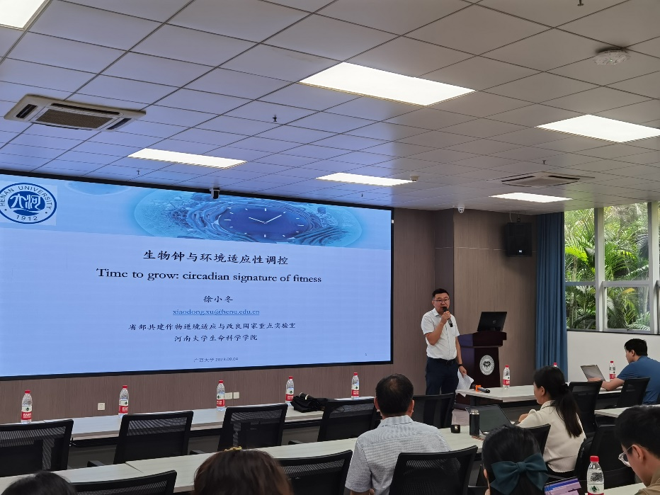 徐小冬教授给我们带来了题为植物生物钟与环境适应性调控的精彩报告,向我们介绍了时间生物学的发展以及生物钟核心振荡器的工作机理、生物钟响应环境授时因子的信号转导途径、生物钟与关键农艺性状调控。