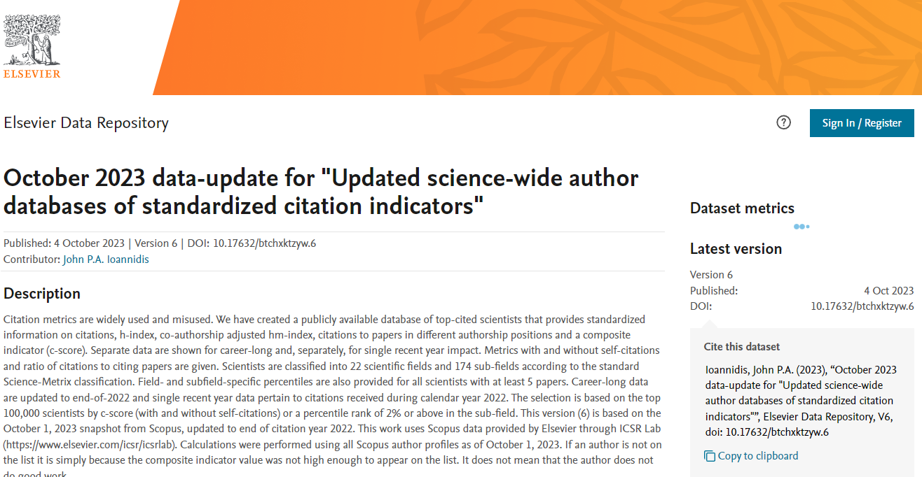全球前2%顶尖科学家榜单是基于Scopus数据库的引用数据系统分析,使用六种关键因素指标进行打分,包括总引用量、Hirsch H-index、共同作者修正的Schreiber Hm-index、单独作者、单独或者第一作者,以及单独、第一或者最后作者的文章引用量。从近700万名科学家中遴选出世界排名前2%的科学家,分为22个领域和176个子领域。为科学家长期科研表现提供了一个衡量指标,能够更客观、更真实地反映科学家的影响力。“终身科学影响力排行榜”统计了科学家职业生涯期间的综合影响表现,“2023年度影响力榜单”更集中凸显科学家上一年度的学术影响。