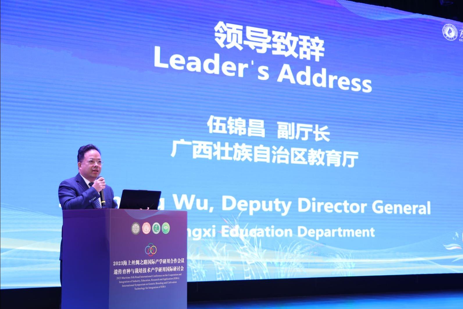 伍锦昌在致辞中表示,国际产学研用会议是全面落实习近平总书记提出的“一带一路”倡议,务实推动共建“一带一路”国家和地区高校、科研院所、企业开展产学研用交流合作的重要平台。他指出,产学研用深度融合,既有利于推动经济增长方式由要素驱动向创新驱动转变,又有利于实现企业、高校和科研院所等产学研用主体形成创新合力,希望广西高校主动融入国际产学研用合作高质量发展新进程,统筹做好“引进来”和“走出去”两篇大文章,积极推动全方位、多层次、宽领域的教育开放合作。