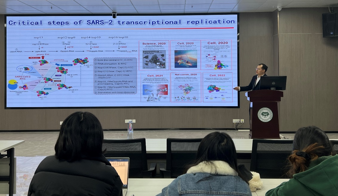 闫利明研究员首先作了题为“冠状病毒转录复制及新靶点发现”学术报告,讲述了他在冠状病毒领域的探索历程。新型冠状病毒具有正链RNA病毒最大的基因组,它编码16个非结构蛋白,在RNA复制过程中,这些非结构蛋白组成转录复制复合体RTC来完成基因组和亚基因组的合成。闫利明研究员利用结构生物学手段深入探究新冠病毒RNA复制起始、延伸、加帽和错配修复过程中相关RTC的工作机制,发现了一系列抗病毒药物的新靶点。这些工作为研发高效、广谱的抗病毒药物奠定了坚实的基础。