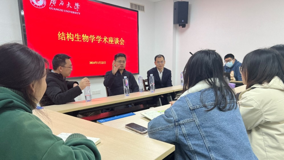 报告结束后,明振华教授在国重室103会议室举办了结构生物学学术座谈会,参会师生就结构生物学领域的前沿进展和关键技术问题与两位专家进行了进一步讨论和互动交流。