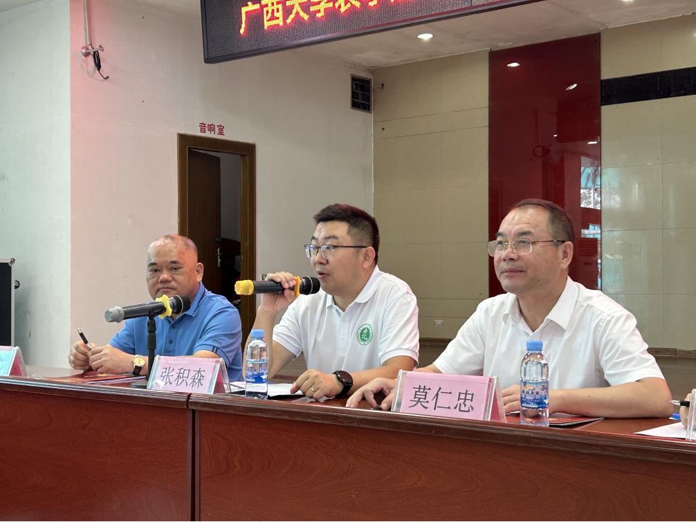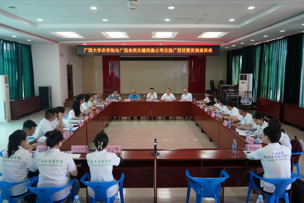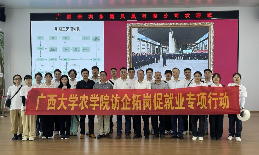 7月8日下午,农学院暑期社会实践团在农学院党委书记、亚热带国重室主任张积森的带领下,赴广西来宾东糖凤凰有限公司开展“访企拓岗”促就业专项行动。来宾市糖业局副局长莫仁忠、东糖投资有限公司总裁助理张新天、东糖凤凰有限公司总经理陈进及专家老师、企业优秀校友出席本次活动。