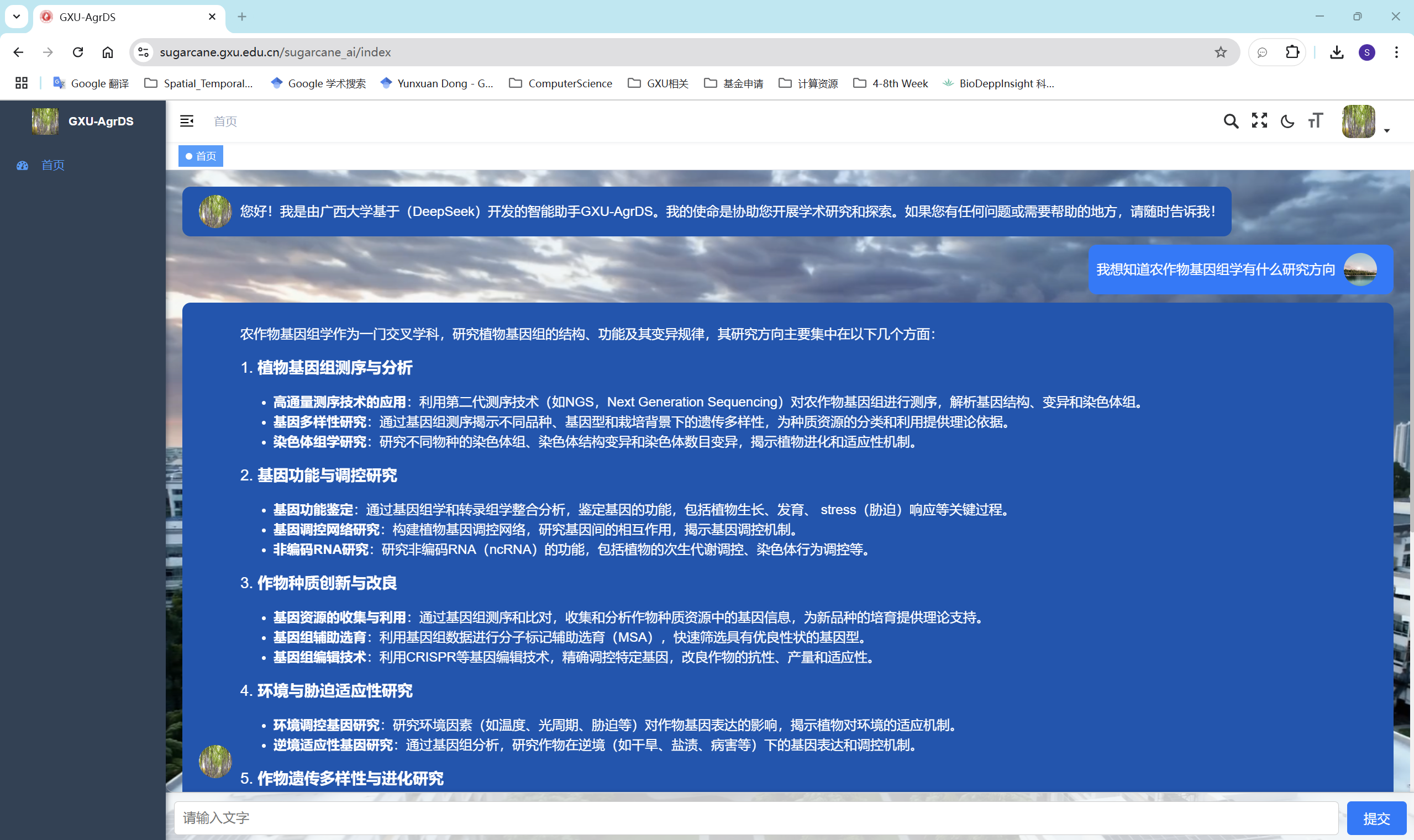 亚热带国重室下设的农业大数据中心于2022年9月筹备成立,并于2023年6月正式投入运营。AgrDS_V0的发布正是基于该中心在智慧农业领域的前期积累。与常见的外部大模型或API(应用编程接口)调用不同,该平台完全在校内服务器上运行,既能保障科研数据的安全,也能提升大模型的响应速度。在试用期内,校内外用户可通过域名https://sugarcane.gxu.edu.cn/sugarcane_ai/注册登录后体验网页版AgrDS_V0的聊天功能,或通过https://sugarcane.gxu.edu.cn/sugarcane_ai_backup/体验匿名版聊天功能。