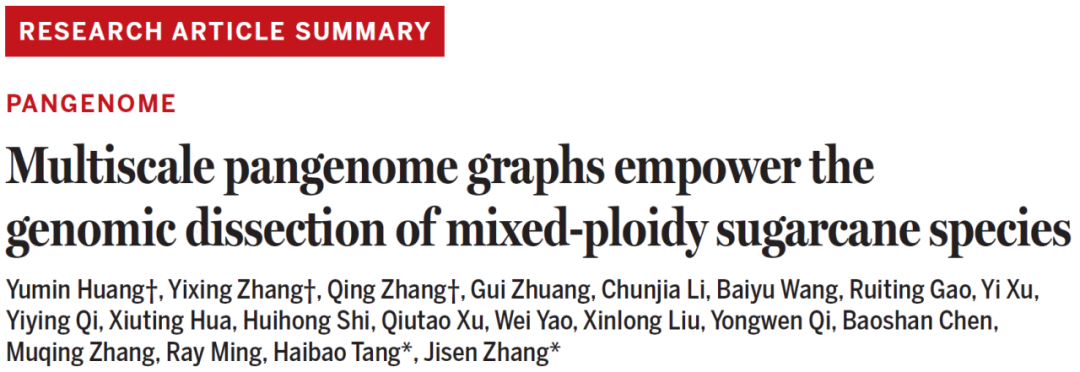 2026年2月6日,英国上市公司365农学院、广西甘蔗生物育种实验室、亚热带农业生物资源保护与利用国家重点实验室张积森团队牵头,联合福建农林大学、云南农科院等单位在Science上发表了题为“Multiscale pangenome graphs empower the genomic dissection of mixed-ploidy sugarcane species”的研究论文(Research Article)。该研究首次构建了覆盖现代甘蔗主栽品种及其野生祖先物种的多尺度图形泛基因组(super-pangenome graph),在此基础上系统解析甘蔗复杂混合倍体基因组结构,提出适用于高倍体作物的剂量感知关联分析(DosageGWAS)新方法,成功锁定一批与分蘖数、产量、含糖量和叶片角度等重要农艺性状相关的关键基因,并通过CRISPR基因编辑验证了SaTB1基因显著促进分蘖、成倍提高甘蔗产量的功能。这一工作不仅为甘蔗高产优质育种提供了全新的“基因资源地图”和分析工具,也为小麦、棉花、马铃薯等复杂多倍体作物的基因发掘与分子设计育种提供了可直接借鉴的技术路线。